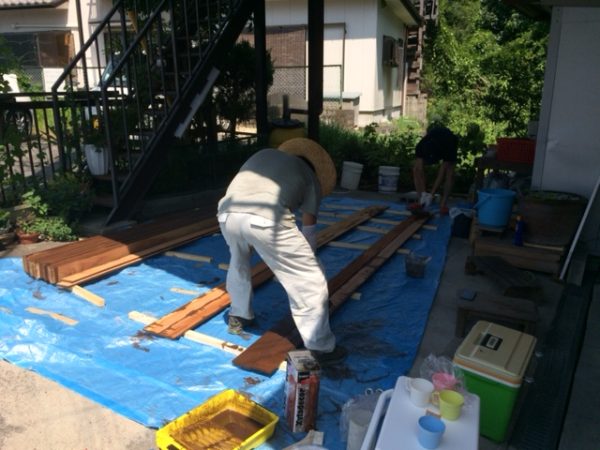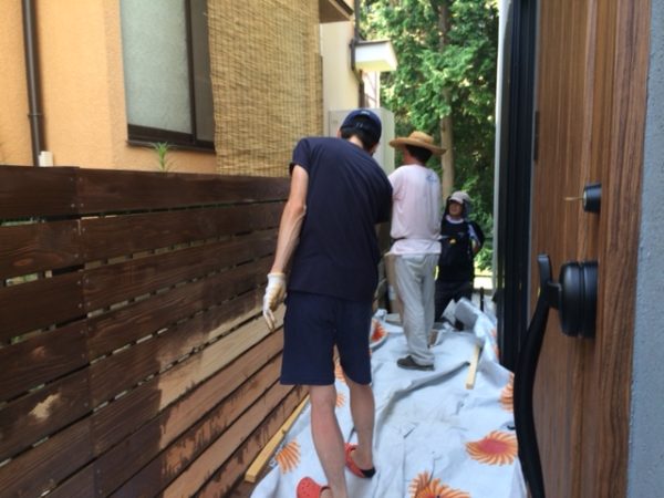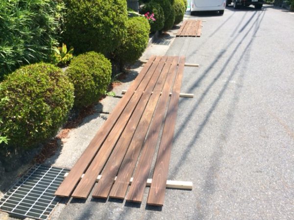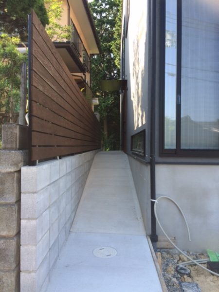 下の写真は施主様がアプローチのルーバー壁を施工された際の写真です。
